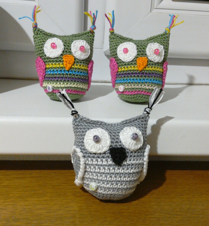 Ahoj všetci, tak trošku pokoja mám večer. Cez víkend som nezaháľala a odhodlala som sa upiecť makrónky, keďže už rok mám doma k tomu potrebnú silikonovú podložku :) Niektoré popukali ale väčšina to vydržala a tak som ich mohla aj naplniť orange curd krémom zmiešaným s mascarpone...Nedávno mi suseda spravila krásne zábery, tak na oplátku som pre jej dcérky sľúbila sovičky, na ktoré má návod Lenka - Fizule71 za čo nesmierne ďakujem lebo sú krásne a ako som tak doháčkovala prvé dve, tak som sa vrhla hneď na tretiu, ktorú som nazvala snežná sova, keďže sa blíži zima :) mala by byť viac biela ale budeme ju nosiť po vonku tak radšej som zvolila sivú...krídielka som si upravila podľa seba a aj začiatočné písmenka mien dievčat som tam prišila...Dúfam, že sa im baby potešia, moje slniečko už so svojou spinká prvú noc :) Prajem krásne dni